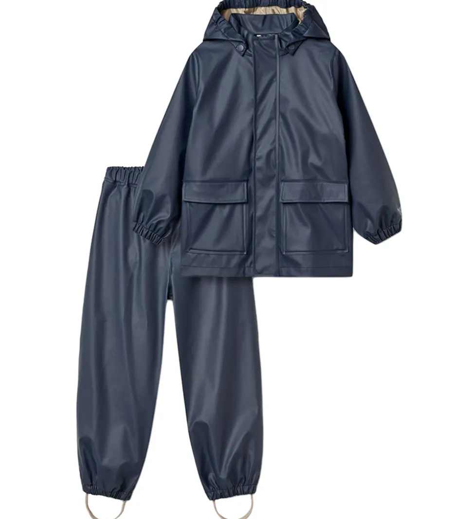 Fint Wheat regntøj af PU i navyblå. Regntøjet består af en regnjakke og et par regnbukser.
