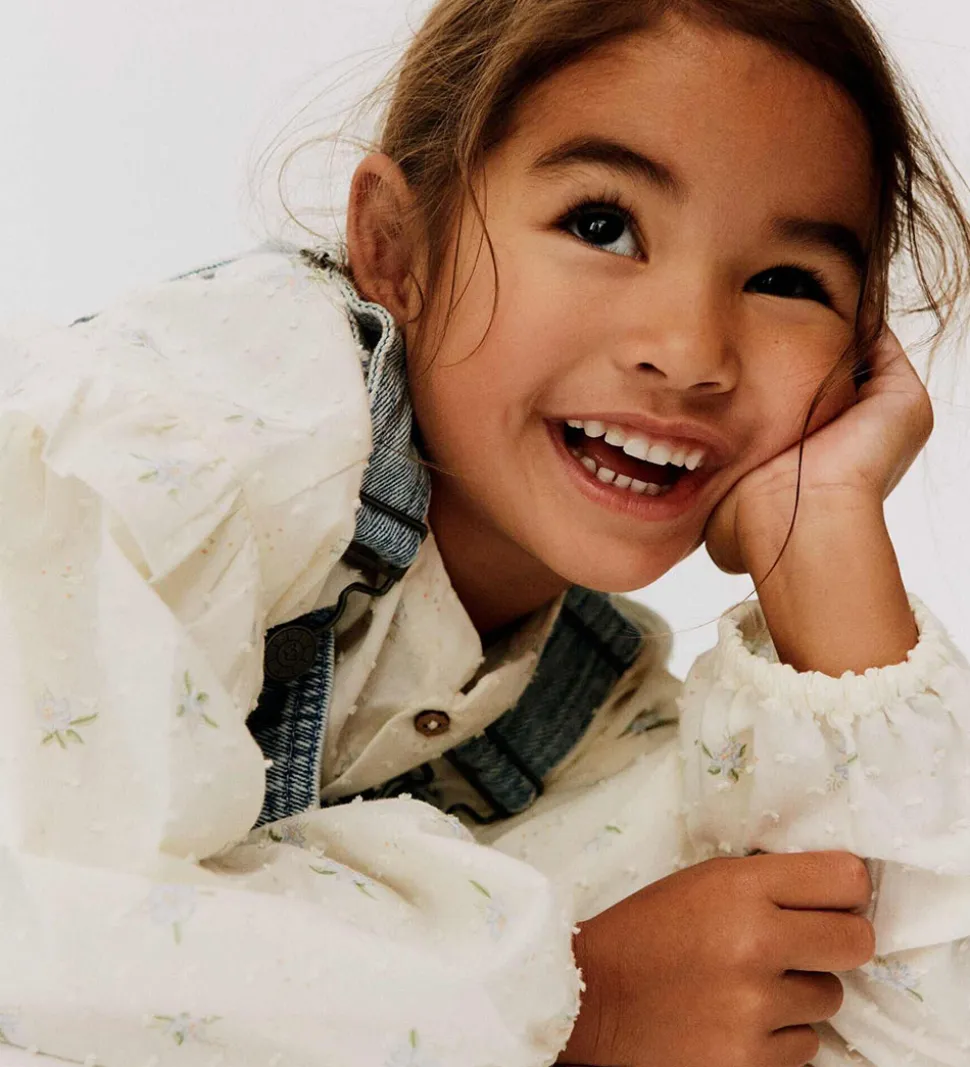 Delikat Wheat skjorte med lange ærmer i hvid med små blomsterprint. Skjorten har en rund halsudskæring og fine knapper langs fronten. Ærmerne har dekorative flæsedetaljer, som giver et særligt udtryk.