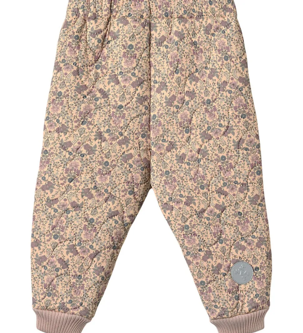 Fine Wheat termobukser i korngul med et farverigt alloverblomsterprint i afdæmpede nuancer samt ribkanter i støvet rosa. Termobukserne har en bølgende, quiltet struktur.