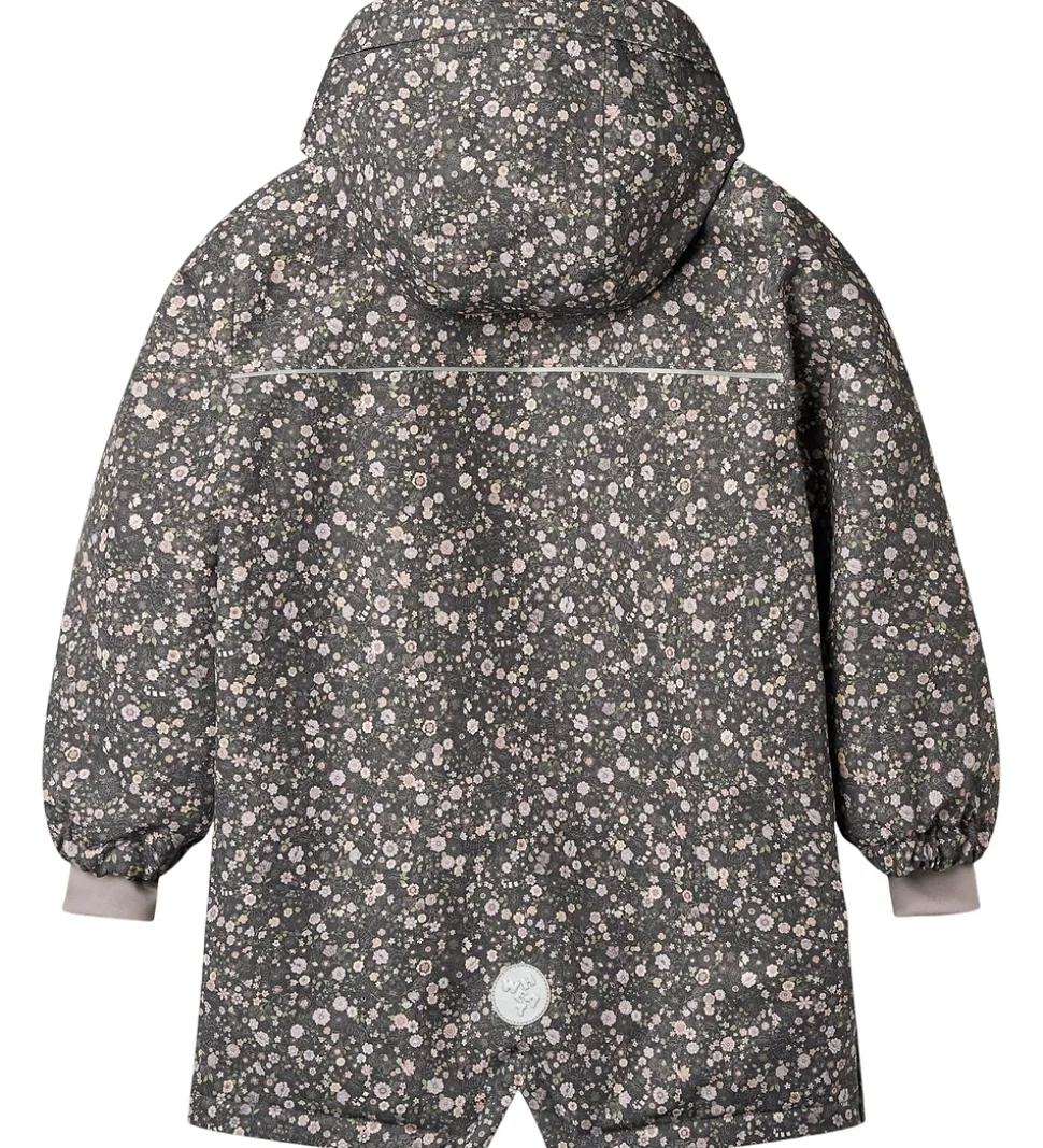 Fin Wheat vinterjakke i mørk koksgrå med et alloverblomsterprint i støvede lilla, rosa og grønne nuancer og velplacerede reflekslogoer.
